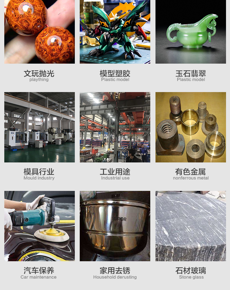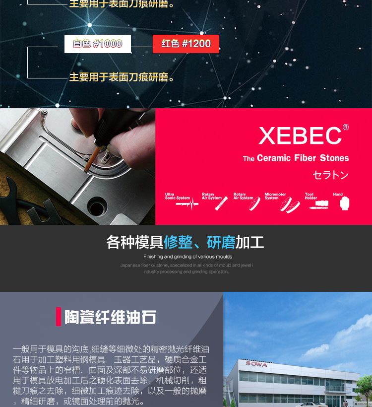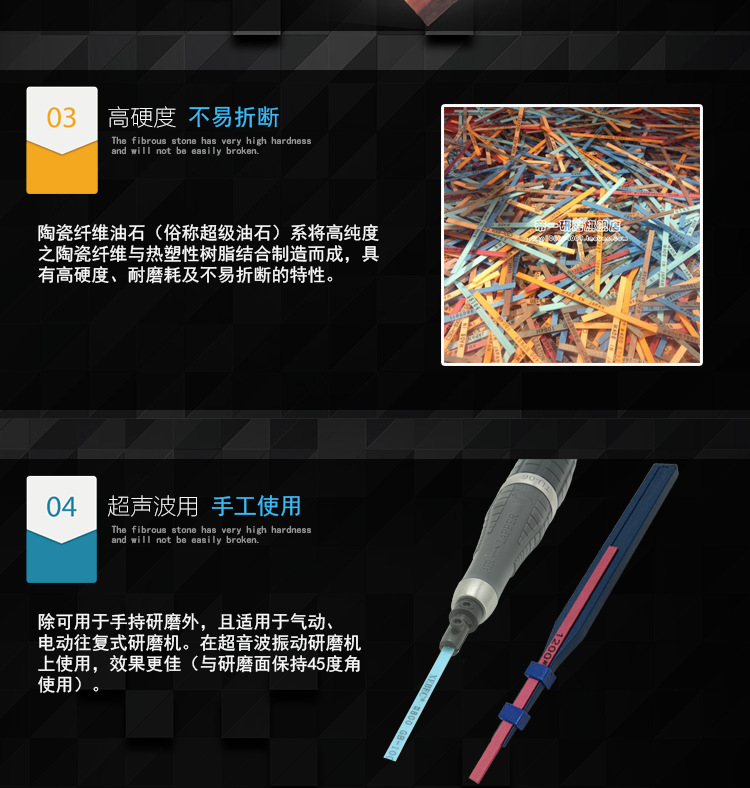 6、除可用于手持研磨外,且適用于氣動、電動往復式研磨機。在超音波振動研磨機上使用,效果最佳(與研磨面保持45度角使用)。陶瓷纖維油石可在各種不同材質(zhì)的模具鋼上研磨加工。最適用于一般難研磨加工處,如窄溝壁、溝底、孔、滑痕、肋部及微小精細處。尤其對于放電加工后積碳層的快速去除及拋光效果更佳。